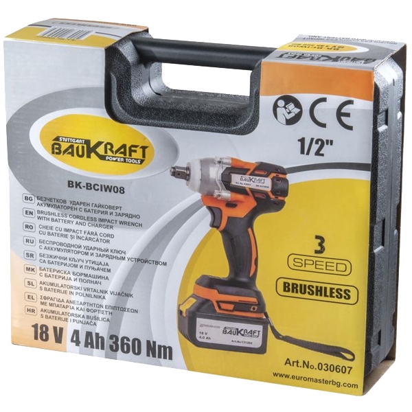 Masina insurubat cu impact Baukraft BK-BCIW08 are prinderea de 1/2 inch, cuplul maxim de 320 Nm.