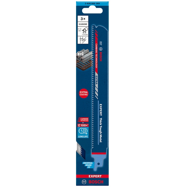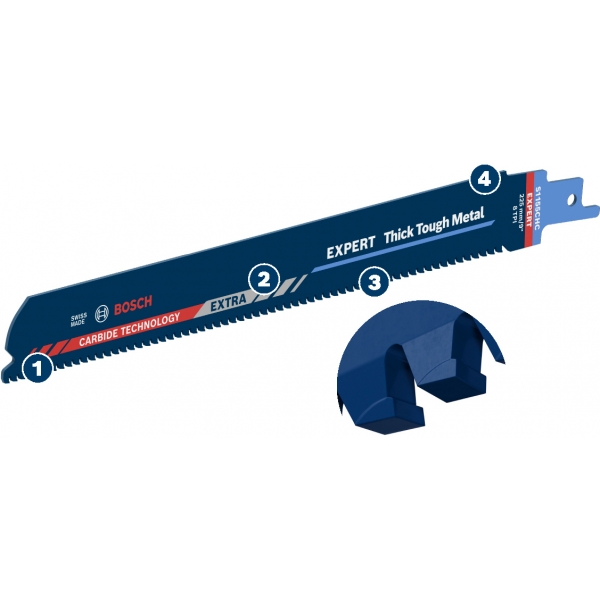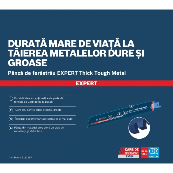 Durabilitatea extrema este incorporata in panza cu ajutorul tehnologiei cu carburi (Carbide Technology) de la Bosch. Dintii fabricati din cel mai dur metal sunt sudati pe un corp lat extra-robust din otel gros - perfect pentru taieri drepte si rezistenta. Profesionistii care nu au folosit pana acum o panza cu carburi de la Bosch vor fi uimiti de ce poate suporta panza de fierastrau sabie Bosch EXPERT Thick Tough Metal.