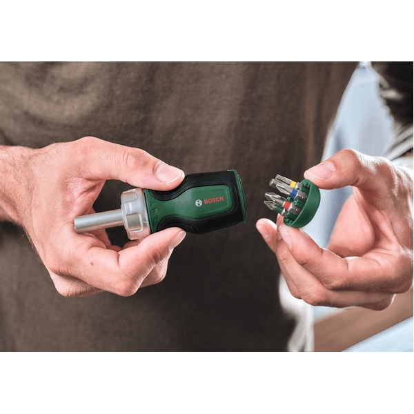 Caseta pentru biti in interiorul manerului pentru acces usor la 6 biti de diferite dimensiuni, codati pe culori, din otel S2.