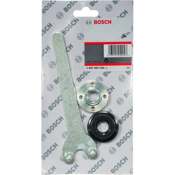 Set 3 piese de prindere pentru polizoare unghiulare mici constand din piulita rotunda (1603340015), flansa (160503084), cheie pentru splinturi (1607950043).