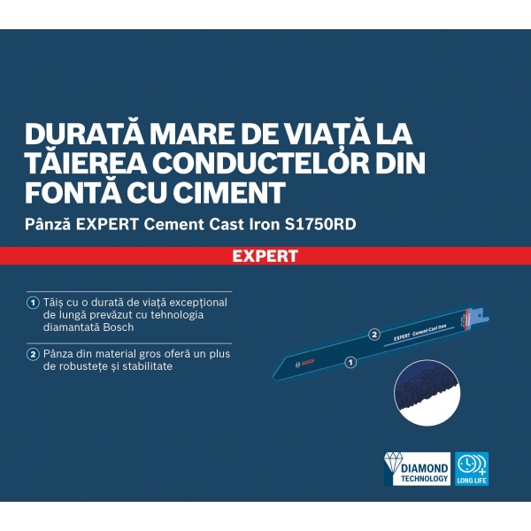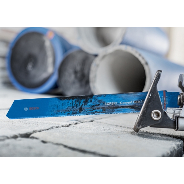 Asa este - o panza de ferastrau sabie acoperita cu diamant. Panza de fierastrau sabie Bosch EXPERT Cement Cast Iron poate parea stralucitoare, dar se potriveste perfect in cele mai dure conditii de santier si exceleaza la cele mai incomode lucrari: poate taia tevi din fonta captusite cu ciment si supravietui.
