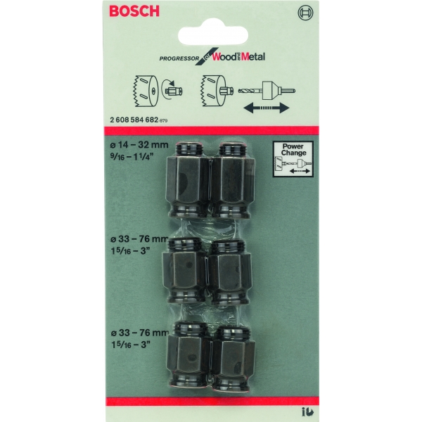 Set adaptor de trecere, 6 bucati, pentru carote standard ale firmelor concurente (de exemplu Starrett, Baco, Lenox etc.) cu 2 adaptoare pentru 14-30 mm (filet 1/2 inch -20UNF), 4 adaptoare pentru 32-210 mm (filet 5/8 inch-18UNF).