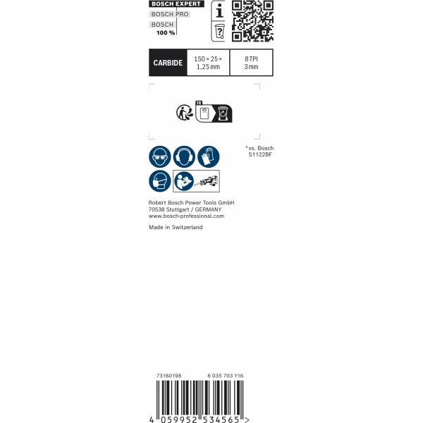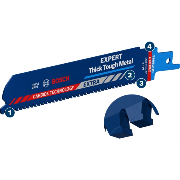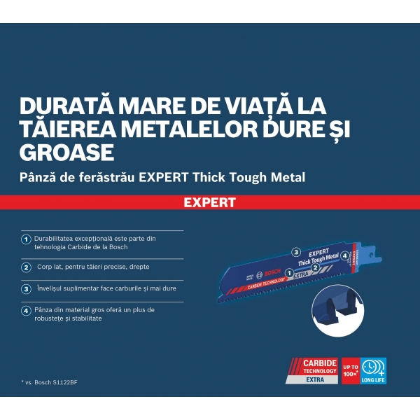 Durabilitatea extrema este incorporata in panza cu ajutorul tehnologiei cu carburi (Carbide Technology) de la Bosch. Dintii fabricati din cel mai dur metal sunt sudati pe un corp lat extra-robust din otel gros - perfect pentru taieri drepte si rezistenta. Profesionistii care nu au folosit pana acum o panza cu carburi de la Bosch vor fi uimiti de ce poate suporta panza de fierastrau sabie Bosch EXPERT Thick Tough Metal.