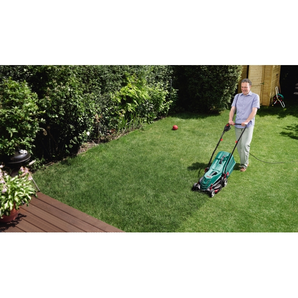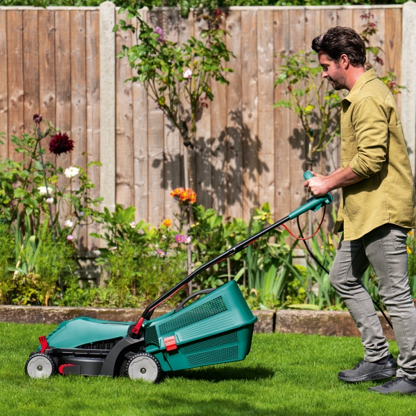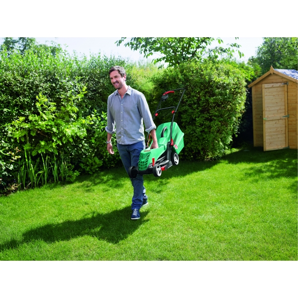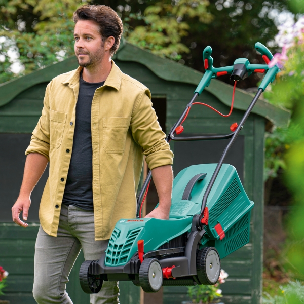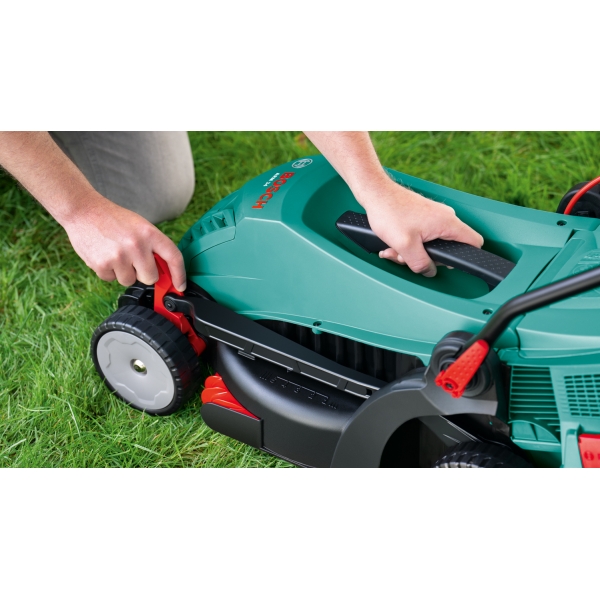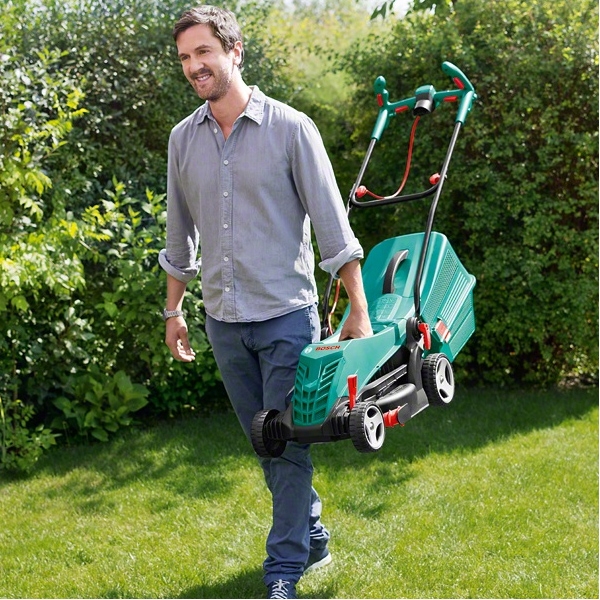 Manere reglabile, proiectate ergonomic, pentru imbunatatirea pozitiei corpului si pentru reducerea solicitarii musculare in timpul tunderii gazonului.