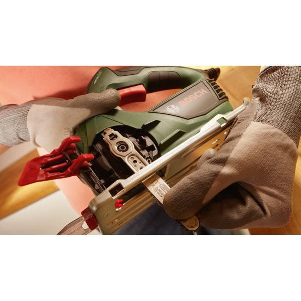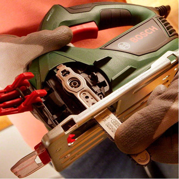 Schimbare usoara, sigura si rapida a panzei de ferastrau prin simpla deschidere a capacului, schimbarea panzei de ferastrau si inchiderea capacului.