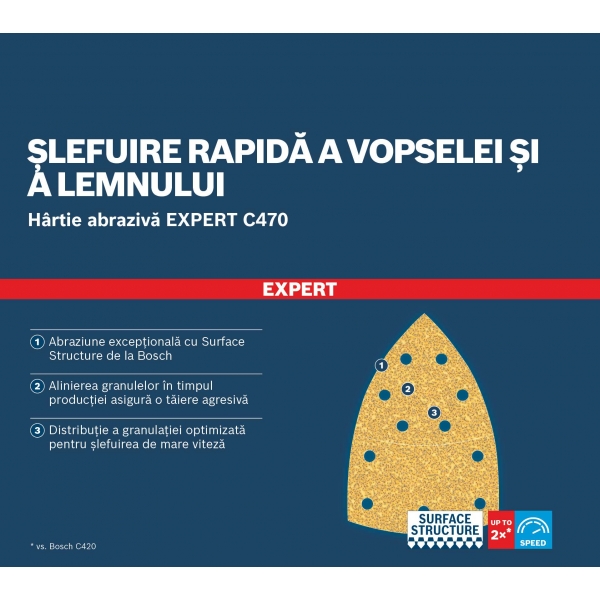 Abraziune exceptionala cu Surface Structure de la Bosch. Datorita stratului nostru de acoperire ce previne infundarea, se aduna mai putin praf in timpul slefuirii si granulatia se afla intotdeauna la starea de eficienta maxima.