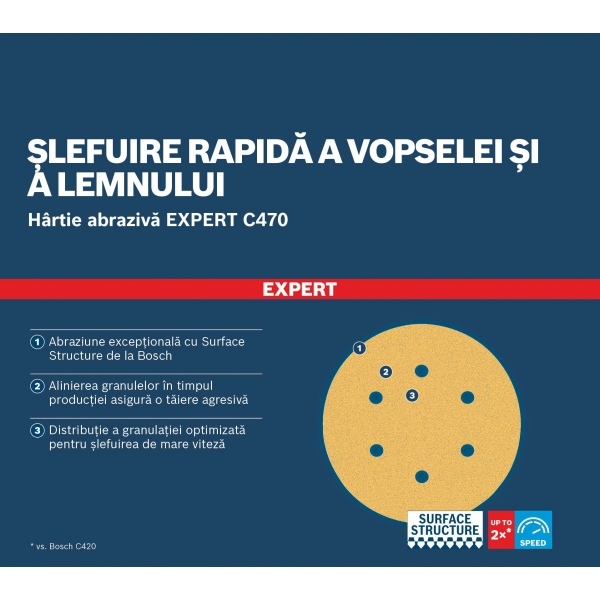 Abraziune exceptionala cu Surface Structure de la Bosch. Datorita stratului nostru de acoperire ce previne infundarea, se aduna mai putin praf in timpul slefuirii si granulatia se afla intotdeauna la starea de eficienta maxima.