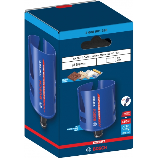 Cu doar cativa dinti uriasi din carburi pe corpul sau din otel, EXPERT Construction Material PC Plus taie cu adevarat. Fantele sale mari sunt optimizate pentru indepartarea rapida a aschiilor, astfel incat taie rapid orice, de la caramida la lemn si placi aglomerate. Tehnologia cu carburi (Carbide Technology) de la Bosch este un amestec optim din cele mai dure materiale si asigura o viata extrem de lunga.