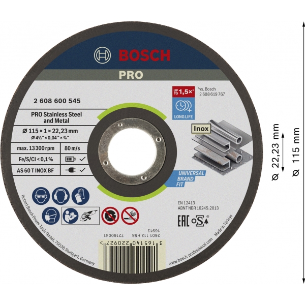Discul de taiere PRO Stainless Steel and Metal foloseste granule de oxid de aluminiu premium pentru a te asigura ca vei obtine taieturi rapide si eficiente in otel inoxidabil si metal. Am combinat granulatia cu materiale functionale de umplutura si le-am incorporat intr-o matrice de rasina fenolica pentru robustete, rezistenta la caldura si performanta stabila. Am consolidat discul cu fibra de sticla de inalta calitate pentru a ne asigura ca este mai sigur de utilizat. In plus, l-am fabricat fara fier. De aceea, nu trebuie sa iti faci griji cu privire la rugina de pe piesa de lucru, daca tai doar otel inoxidabil.