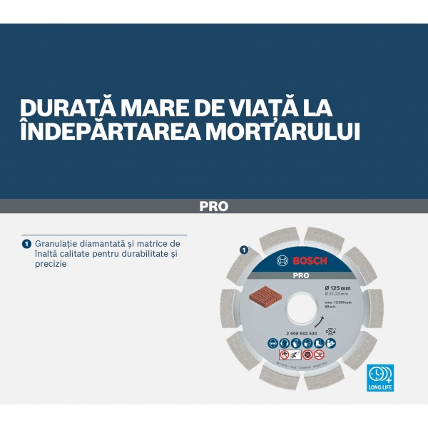 Indiferent daca utilizezi mortar de culori diferite sau inlocuiesti mortarul vechi, PRO Mortar te ajuta sa economisesti timp pregatind zidaria pentru mortar nou. Pulberile diamantate abrazive de inalta calitate fixate pe o matrice metalica premium asigura durabilitate si performanta excelenta.