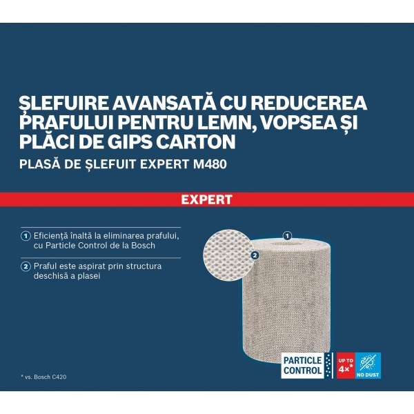 Reducing dust when sanding is not easy, but we"ve found a solution. This Bosch EXPERT M480 Sanding Net uses our Particle Control technology to keep the dust level to a minimum.