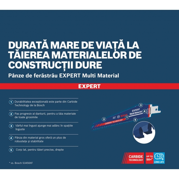 Durabilitate de pana la 50 de ori mai mare decat o panza de ferastrau Bosch S3456XF in materialele dure