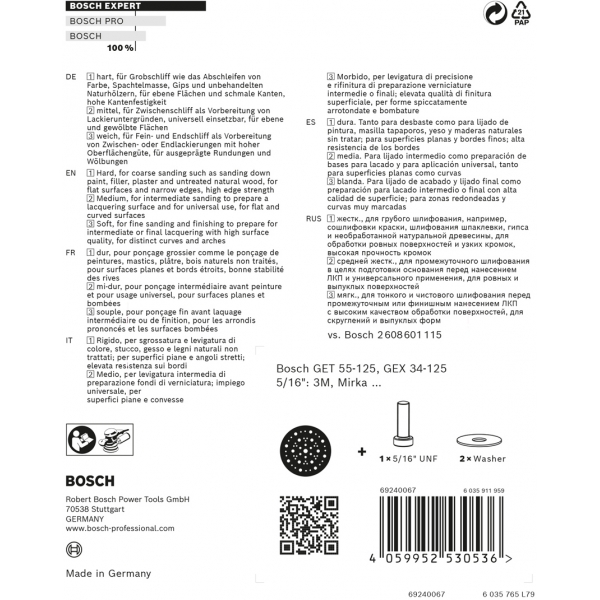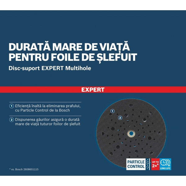 Discul-suport EXPERT Multihole este un element integrant al sistemului Particle Control de la Bosch. Gaurile aparent aleatorii sunt rezultatul unei cercetari laborioase: matematic, se vor alinia cu hartia suficiente gauri pentru a asigura o aspirare optima a prafului. Aceasta inseamna ca foile nu se vor incarca si vor rezista mai mult. Este disponibil in versiunile dura, medie si moale, in functie de tipul de slefuire care trebuie realizat.