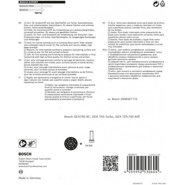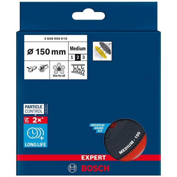 Discul-suport EXPERT Multihole este un element integrant al sistemului Particle Control de la Bosch. Gaurile aparent aleatorii sunt rezultatul unei cercetari laborioase: matematic, se vor alinia cu hartia suficiente gauri pentru a asigura o aspirare optima a prafului. Aceasta inseamna ca foile nu se vor incarca si vor rezista mai mult. Este disponibil in versiunile dura, medie si moale, in functie de tipul de slefuire care trebuie realizat.