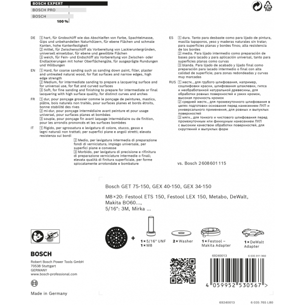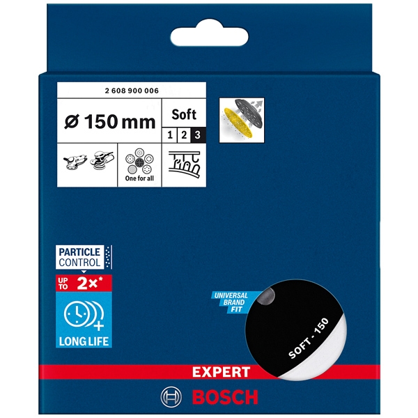 Discul-suport EXPERT Multihole este un element integrant al sistemului Particle Control de la Bosch. Gaurile aparent aleatorii sunt rezultatul unei cercetari laborioase: matematic, se vor alinia cu hartia suficiente gauri pentru a asigura o aspirare optima a prafului. Aceasta inseamna ca foile nu se vor incarca si vor rezista mai mult. Este disponibil in versiunile dura, medie si moale, in functie de tipul de slefuire care trebuie realizat.