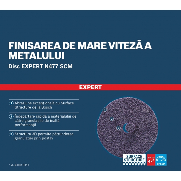 Facand parte din gama de solutii abrazive avansate, bazate pe tehnologia Surface Structure de la Bosch, discul EXPERT N477 SCM combina duritatea granulelor de oxid de aluminiu acoperite cu ceramica cu o structura 3D netesuta, pentru a oferi un SCM pentru taiere rapida, care nu lasa urme. Aceste discuri sunt ideale pentru netezirea zgarieturilor lasate de discurile din fibre #36 pe otelul moale.