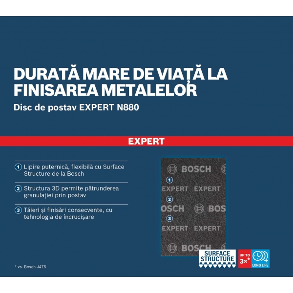 Discul din postav EXPERT N880 este un exemplu pentru Surface Structure de la Bosch: combina cea mai recenta tehnologie in materie de abrazivi si expertiza in ceea ce priveste fabricatia intr-un postav unic, extrem de durabil. Produsul tridimensional realizat cu tehnologie de incrucisare economiseste banii profesionistilor datorita performantei sale de durata si reduce la minimum frustrarea provocata de foile de slefuit manual a caror granulatie se desprinde.