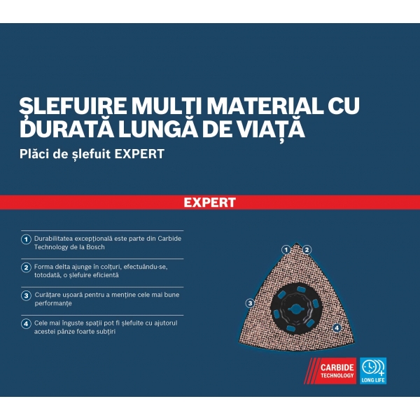 Utilizand tehnologia cu carburi (Carbide Technology) de la Bosch, granulatia din cel mai dur metal este bine fixata pe suprafata. Aceasta granulatie ascutita ramane pe deplin eficienta pe durata sa de viata indelungata, deoarece o puteti curata cu un solvent. Placa de slefuit EXPERT este proiectata pentru mai multe materiale si diversi utilizatori.