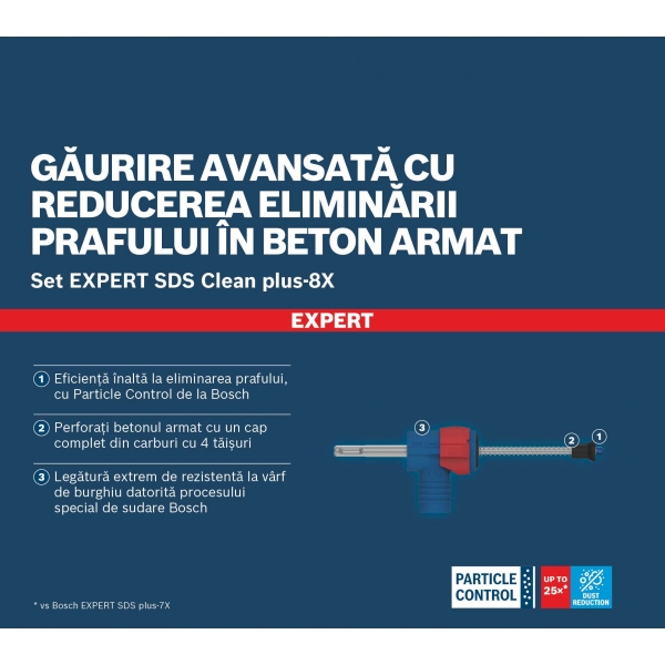 Reducerea prafului este de pana la 25 de ori mai buna decat in cazul unui burghiu Bosch EXPERT SDS plus-7X.
