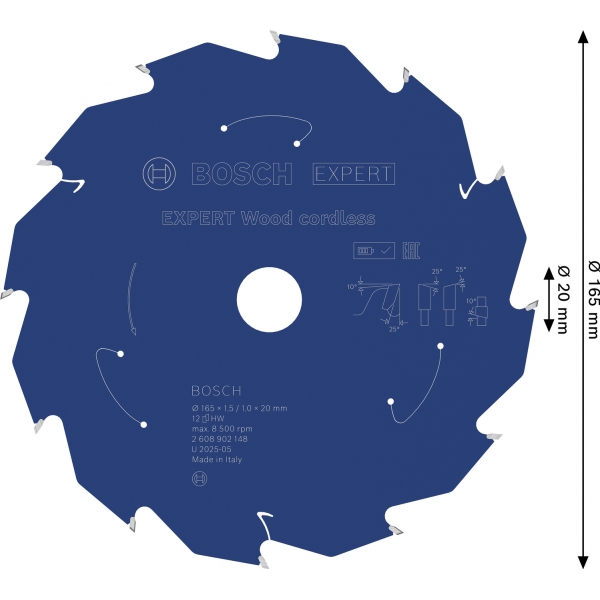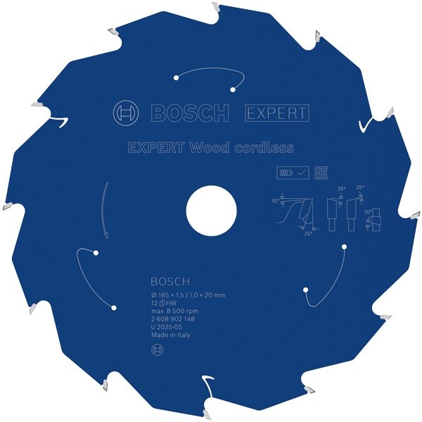 Panza de fierastrau circular EXPERT Wood cordless, 165 x 1,5/1 x 20 mm, T12.