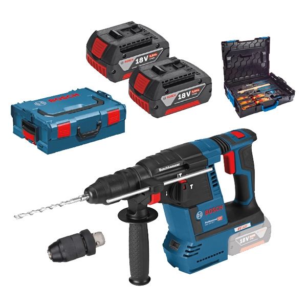 | Set de livrare | 2 acumulatori, Li-Ion, 18 V si 5 Ah Incarcator rapid GAL 1880 CV Valiza speciala L-Boxx Maner lateral Limitator de reglare a adancimii 210 mm Mandrina rapida 13 mm Mandrina interschimbabila SDS-Plus Trusa scule de mana -cleste pentru instalatori -ciocan lacatuserie: 500 grame -cleste pentru sarma: 250 mm -set 9 chei imbus -set 9 chei torx -set surubelnite: PH1, PH2, 3 surubelnite plate |