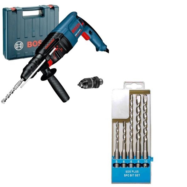 | Set de livrare | 1 x Bosch - GBH 2-26 DFR - Rotopercutor SDS-Plus, 800 W, 2.7 J, mandrina interschimbabila, protectie suprasarcina, valiza plastic Limitator de reglare a adancimii 210 mm Mandrina interschimbabila SDS-Plus Mandrina rapida 13 mm Maner suplimentar Valiza profesionala 1 x Raider - 158101 - Set burghie, SDS-Plus, 5-10 mm, 5 buc |