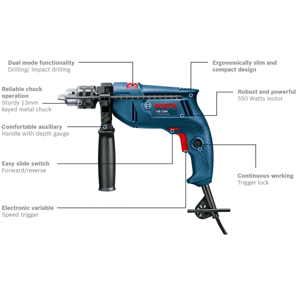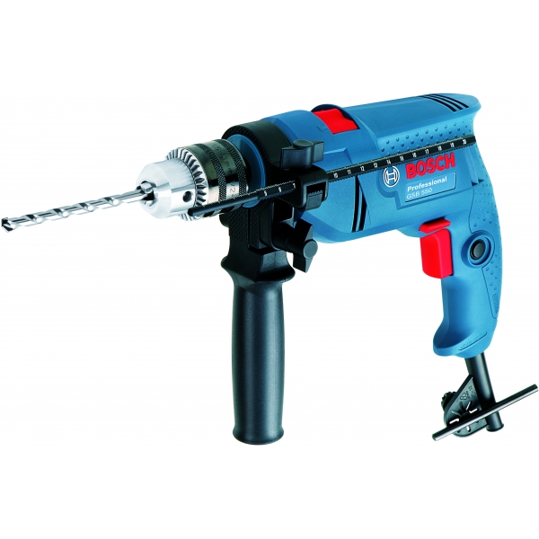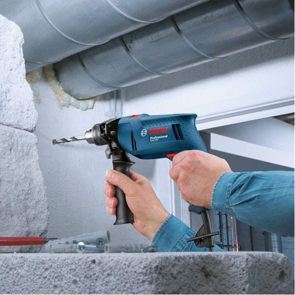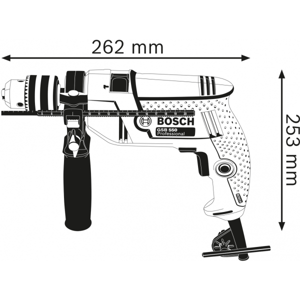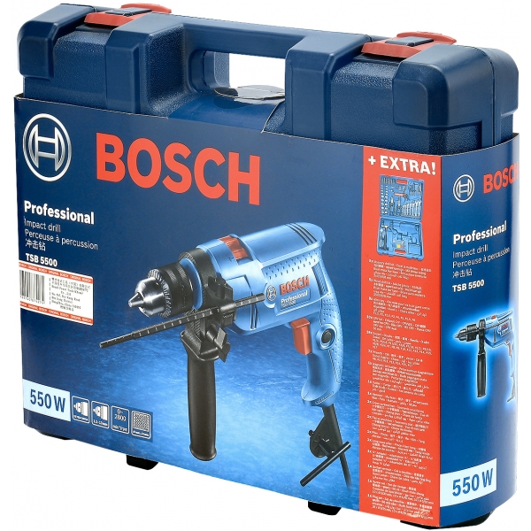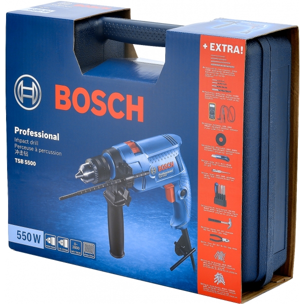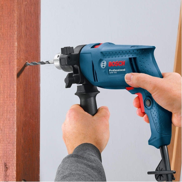 Masina de gaurit cu percutie Bosch GSB 550 este o masina simpla, usor de utilizat, cu o gama foarte larga de aplicatii de la gaurire fara percutie in materiale diverse precum lemn, plastic, metal, placi ceramice, la gaurire cu percutie in zidarie, piatra, sape, tencuieli etc.