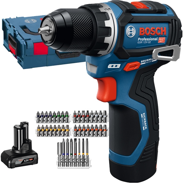 GSR 12V-32 Professional cu acumulator ofera cel mai bun control al sculei datorita tehnologiei Advanced KickBack Control. Aceasta tehnologie minimizeaza riscul de ranire daca un burghiu se blocheaza brusc sau chiar daca scula se roteste incet in jurul axei de gaurire si forta de fixare creste lent.