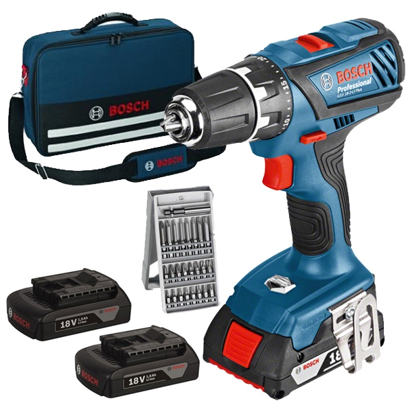 Bosch - GSR 18-2 LI PLUS - Masina de gaurit-insurubat cu 3 acumulatori Li-Ion 18 V si 1.5 Ah si set 25 biti + geanta textila