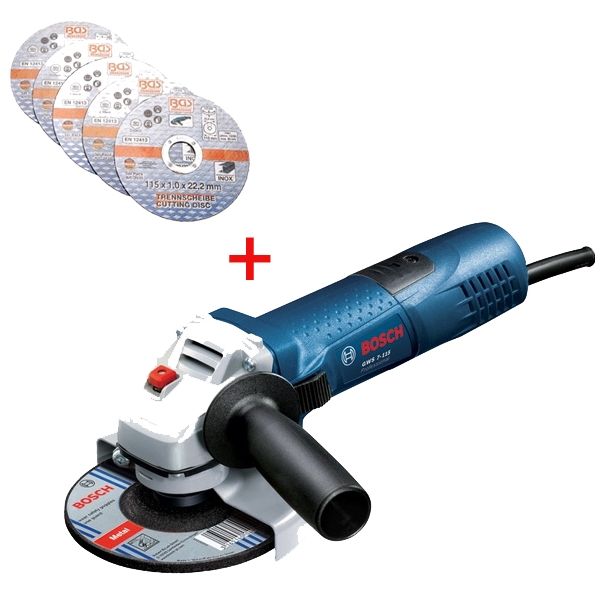 Bosch GWS 7-115 + 5 discuri BGS - Pachet Polizor unghiular mic + Set 5 discuri pentru otel inoxidabil