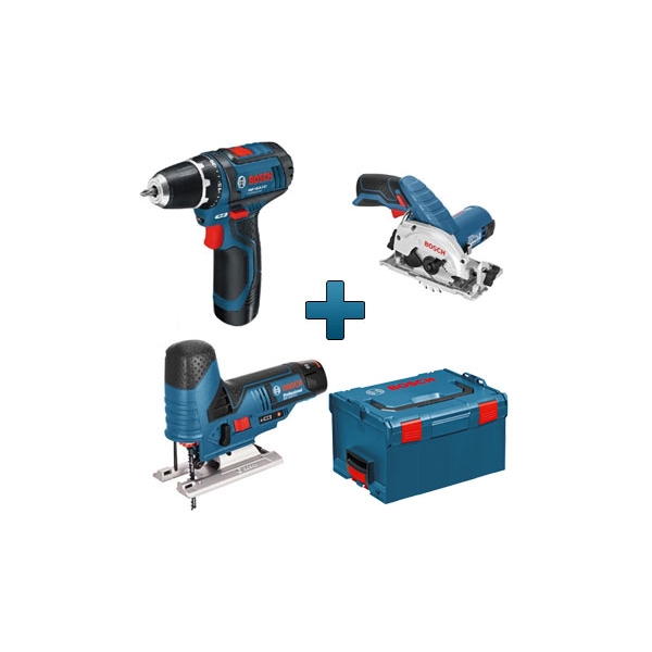 | Set de livrare | GSR 10,8-2 LI Masina de gaurit/insurubat cu acumulator GST 10.8 V-LI Ferastrau vertical cu acumulator GKS 10.8 V-LI Ferastrau circular cu acumulator 2 acumulatori incarcator L-Box |