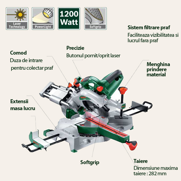 Scala gradata, usor de citit si de pozitionat, si laserul il fac un fierastrau foarte precis. Turatia fara sarcina este de 5200 rpm, calitate utila pentru taieturile repetate, unde precizia este importanta, cat si pentru materialele cu lungime mare.