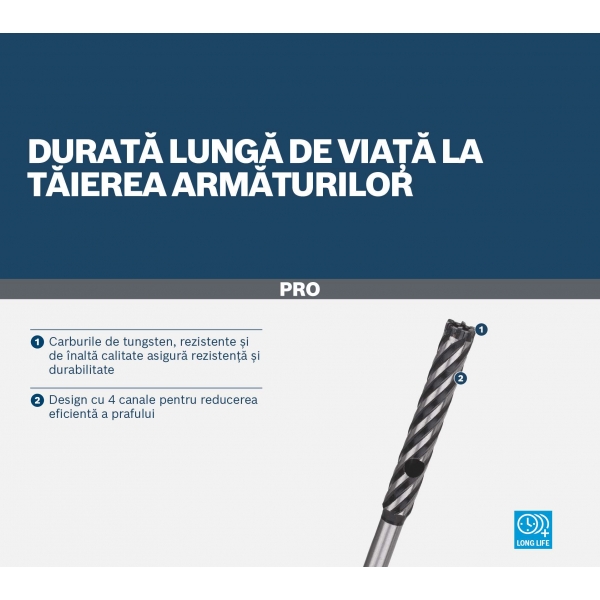 Burghiul PRO SDS plus Rebar Cutter este un burghiu durabil pentru lucratorii in constructii care trebuie sa gaureasca beton armat. I-am fixat ferm dintii puternici din carburi si le-am dat o forma speciala pentru a ne asigura ca burghiul rezista la uzura si gaureste rapid armaturile. Canelurile sunt proiectate pentru a indeparta praful in mod eficient, in timp ce orificiul de expansiune al burghiului reduce caldura si ajuta la eliminarea aschiilor de metal.