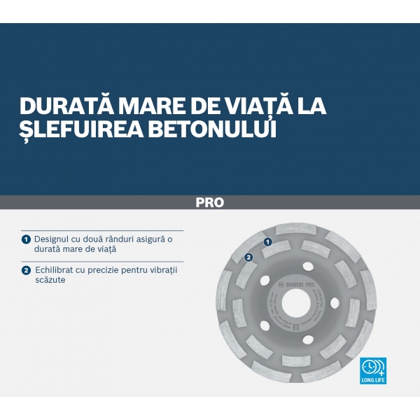 PRO Concrete are un design cu doua randuri care optimizeaza slefuirea pe o suprafata mare pentru o durata de viata mai mare a produsului. Echilibrat cu precizie pentru vibratii scazute, permite profesionistilor sa lucreze eficient si usor.