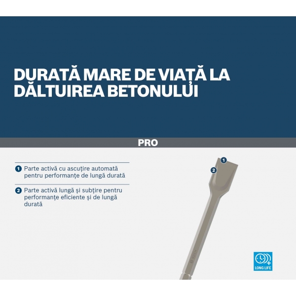 Parte activa cu ascutire automata pentru performante de lunga durata. Datorita designului sau special, taisul daltii ramane ascutit pe masura ce se uzeaza.