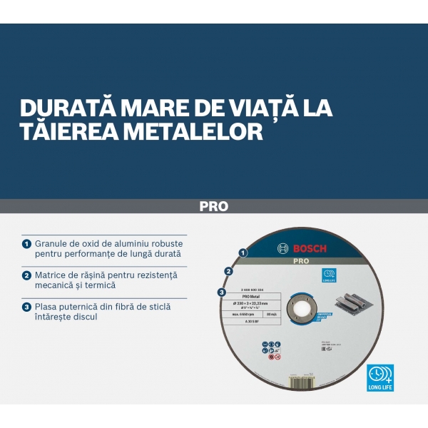 Am fabricat discul de taiere durabil PRO Metal cu granule de oxid de aluminiu premium, pentru a ne asigura ca taie eficient. De asemenea, am combinat granulatia cu materiale de umplutura functionale si le-am incorporat intr-o matrice de rasina fenolica pentru rezistenta mecanica si termica. Am consolidat discul cu o plasa din fibra de sticla de inalta calitate pentru a asigura o performanta mai sigura si mai stabila.