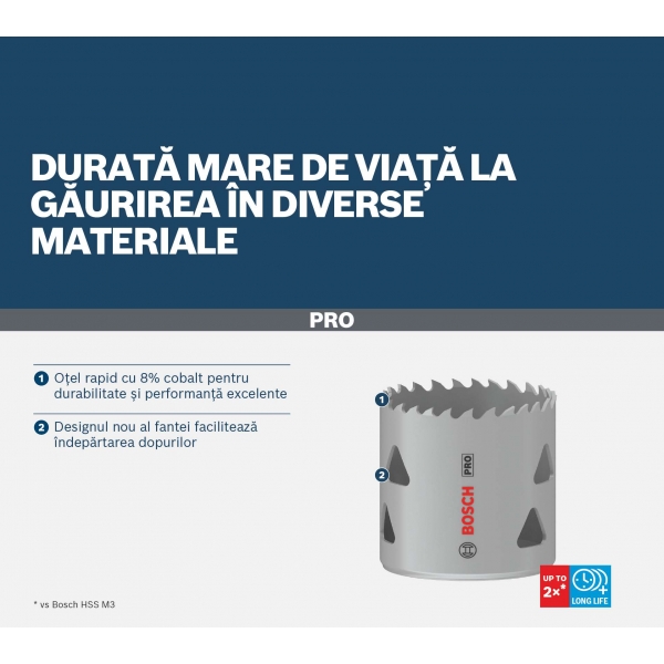 PRO Multi Material are un model imbunatatit al dintilor pentru taieturi rapide si netede si dinti din aliaj HSS cu continut ridicat de cobalt pentru durabilitate. Asigura o taiere eficienta a gaurilor in placarile din otel si placile de gips carton. Power Change Plus faciliteaza schimbarea mai rapida a carotelor si burghielor pentru gauri pilot si indepartarea mai usoara a dopurilor de material.