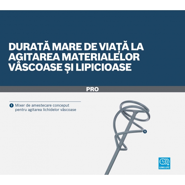 Am creat PRO Multi Material Viscous and Sticky pentru profesionistii care trebuie sa amestece gips-carton, mortar si tencuiala. Palele sale se agita in sus, ceea ce impiedica bulele de aer sa ramana in material si fac mixerul usor de ghidat.