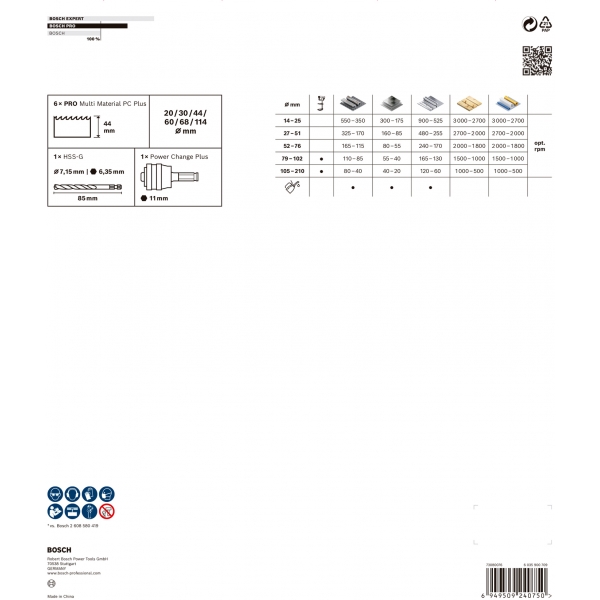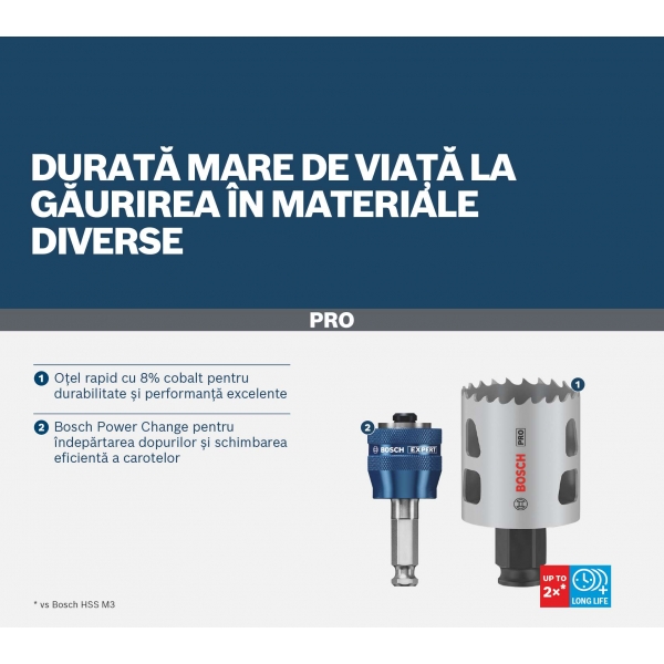 Carota PRO Multi Material are un model imbunatatit al dintilor pentru taieturi rapide si netede si dinti din aliaj HSS cu continut ridicat de cobalt pentru longevitate. Aceasta taie eficient placarile din otel si placile din gips carton. Sistemul Power Change Plus permite schimbarea mai rapida a carotelor si burghielor pentru gauri pilot si faciliteaza indepartarea materialului taiat.