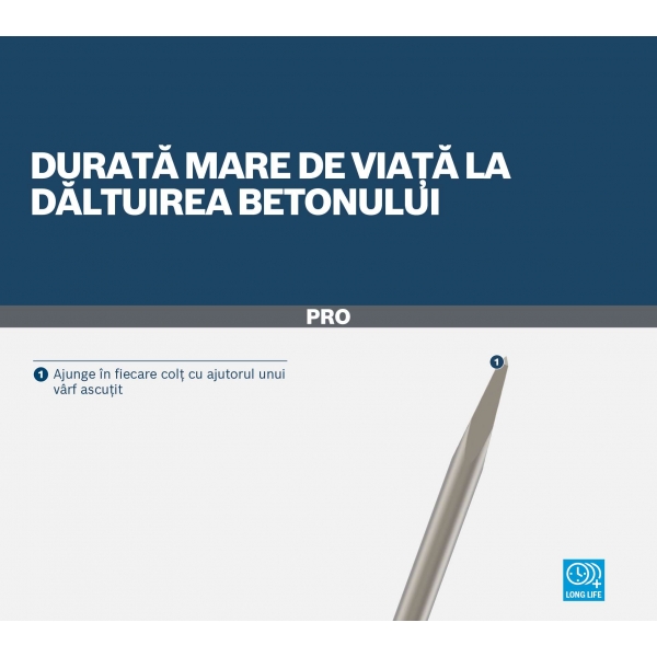 PRO SDS max-4C este o alegere excelenta pentru renovatori, lucratori in finisaje interioare si instalatori care au nevoie de o dalta fiabila pentru a sparge betonul. Dalta are un varf ascutit, pentru o durata mare de viata si precizie. Designul varfului te asigura ca dalta functioneaza fara probleme, cu o rata mare de indepartare a materialului si fara blocaje.