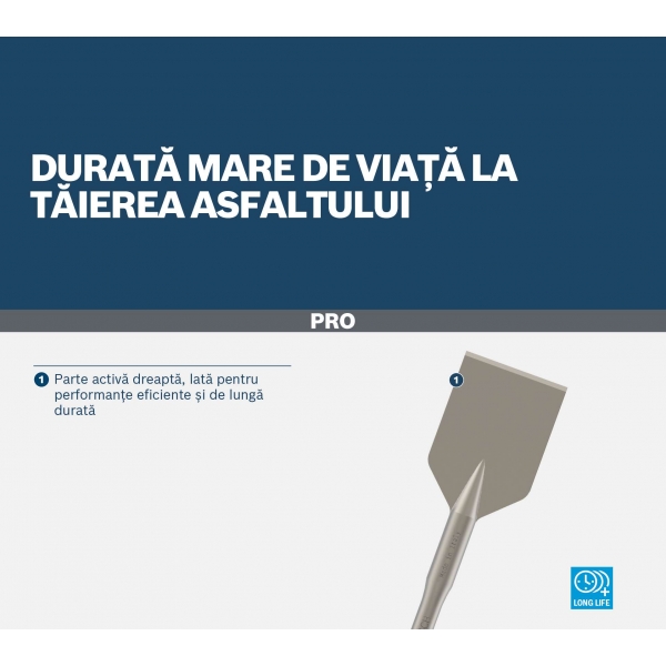 PRO SDS max Asphalt Cutter este o alegere excelenta pentru lucratorii de intretinere a drumurilor care au nevoie de o dalta de demolare durabila pentru a sparge si a indeparta portiuni de asfalt. Partea sa activa este puternica si durabila. Am fabricat-o dreapta si lata pentru a ne asigura ca poti taia asfaltul cu usurinta.
