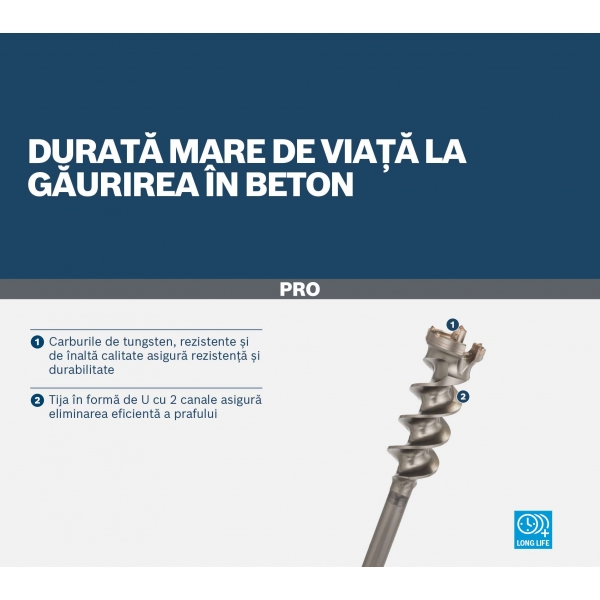 PRO SDS max Break Through gaureste materialul cu varful sau cu 3 muchii taietoare. Fabricat din carburi de inalta calitate, lipite in vid si calite pentru rezistenta si performanta de lunga durata. Cele doua caneluri in forma de U ale burghiului si tija conica impiedica infundarea acestuia cu praf si bucati de beton. Foloseste-l pentru a realiza gauri cu diametrul de 45-80 mm.
