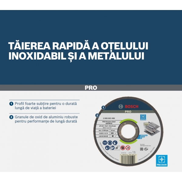 Ai nevoie de un disc de taiere pentru a efectua taieturi rapide si precise cu polizorul unghiular cu acumulator? Incearca discul de taiere din material compozit PRO Stainless Steel and Metal. Granulele abrazive ale discului il fac rezistent la uzura, in timp ce profilul sau extra-subtire taie cu precizie si consuma mai putina energie. Aceasta inseamna ca vei obtine taieturi precise - cat dureaza bateria.