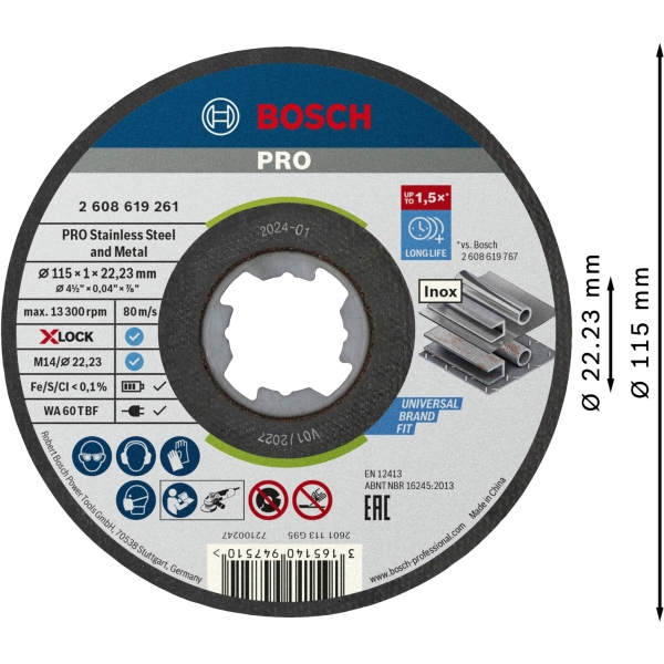 Disc de taiere din material compozit PRO Stainless Steel and Metal, 115 x 1 x 22,23 mm, X-Lock, drept.