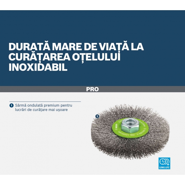 Peria-disc de sarma PRO Stainless Steel clean este o completare durabila pentru orice atelier de prelucrare a metalului unde trebuie sa cureti otel inoxidabil si metale neferoase. Am prevazut-o cu sarma ondulata premium pentru a te asigura ca vei obtine un finisaj fin pe suprafete metalice mici, pe margini si in caneluri.