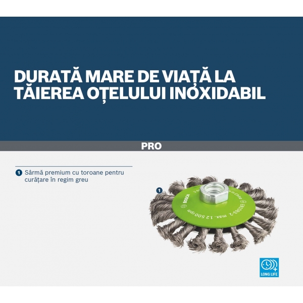Peria conica PRO Stainless Steel heavy este un accesoriu durabil pe care vei dori sa-l ai la indemana in atelierul tau de prelucrare a metalelor. Este prevazuta cu sarma cu noduri premium pentru a te asigura ca va duce la bun sfarsit lucrarile dificile de curatare. Pozitia inclinata a firelor te ajuta sa ajungi mai usor la suprafetele mici, canelurile si marginile pieselor din otel - din nou si din nou.