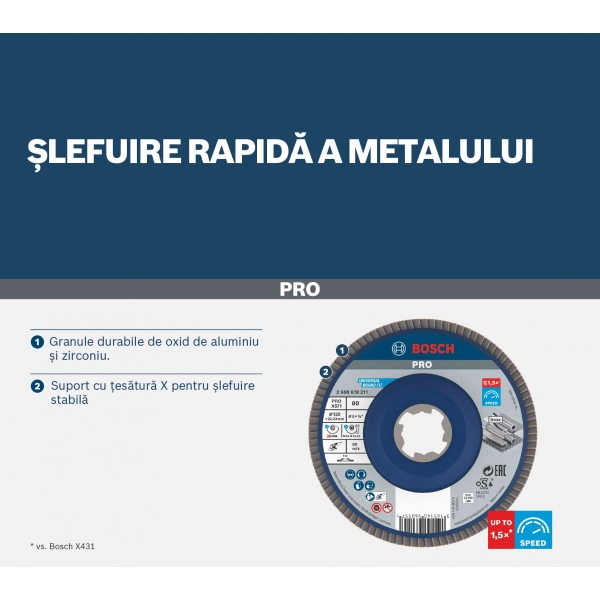 Discul de slefuire evantai PRO X571 are un suport cu tesatura X pentru o slefuire stabila. Fuziunea avansata a granulelor de oxid de aluminiu si zirconiu asigura o indepartare foarte rapida a materialelor, chiar si pe otel calit.