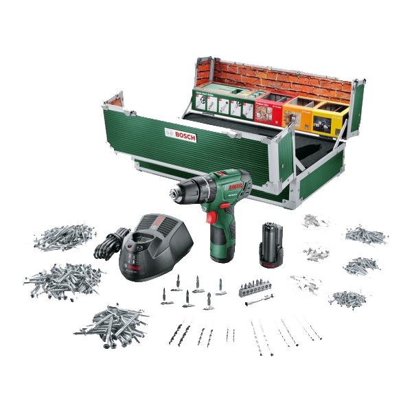 | Set de livrare | 2 acumulatori, Li-Ion, 10.8 V, 2 Ah Incarcator Valiza cu 508 accesorii: - Rosu: Suruburi de 2.5 x 20 mm (65 bucati), dibluri 4 mm (65 bucati) - Portocaliu: 3.5 x 30 mm (40 bucati), dibluri 5 mm (40 bucati) - Galben: 4,5 x 40 mm (30 bucati), dibluri 6 mm (30 bucati) - Verde: 4 x 40 mm (100 bucati) - Albastru: 5 x 40 mm (75 bucati) - Violet: 6 x 60 mm (30 bucati) - Adaptor pentru biti - 6 burghie zidarie - 6 burghie lemn - 20 biti |