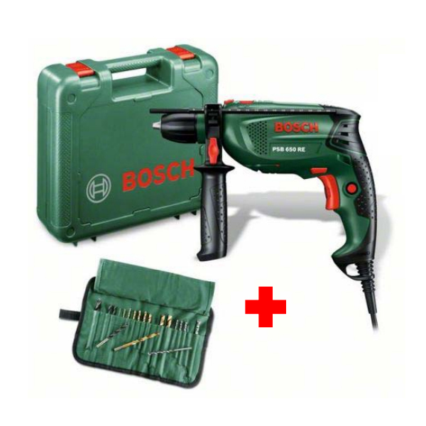Pachetul contine masina de gaurit cu percutie Bosch PSB 650 RE impreuna cu un set de 19 accesorii.