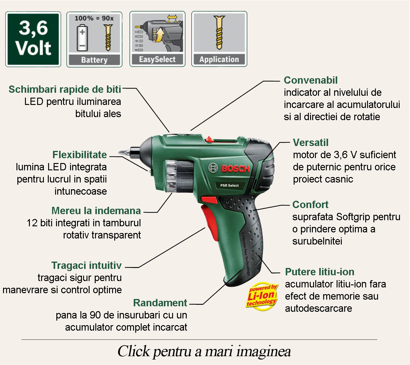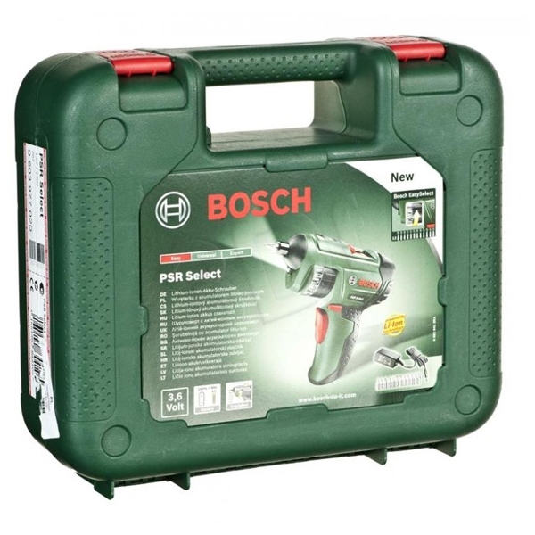 Liderul pe piata europeana in surubelnite cu acumulator a introdus o adevarata inovatie cu PSR Select, revolutionand piata si devenind in scurt timp un accesoriu de nelipsit din trusa oricarui mester. PSR Select este prevazut cu un acumulator litiu-ion de 3,6 V (1,5 Ah), care, incarcat complet, poate efectua pana la 90 de insurubari. Surubelnita cu acumulator este ideala pentru o varietate larga de aplicatii casnice datorita momentul de torsiune maxim de 4,5 Nm si turatiei in gol de 210 rot/min.